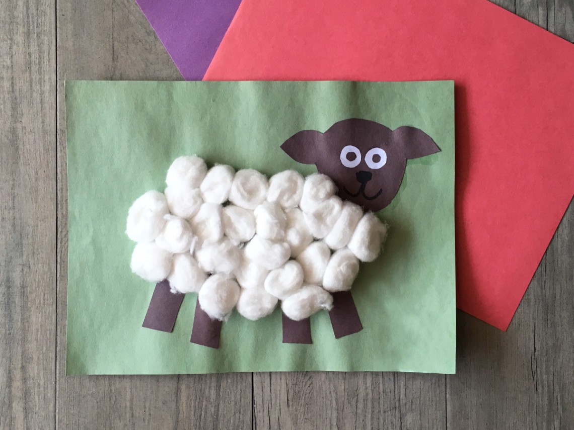 On black construction paper, draw four rectangles for the lamb’s legs, one big circle for the head and two pointy ears. Cut out the pieces. Make the eyes by cutting out two small circles on white paper, then inking the middle with black dots using a black marker. You may also use store-bought googly eyes if you have them on hand.
